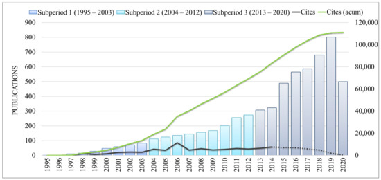 Figure 3 shows the performance analysis of publications and citations of data mining in healthcare over time from 1995 to July 2020 in the WoS. The first sub-period (1995–2003) shows the beginning of the research field with 316 documents and a total of 13,483 citations. Besides, the first article in the WoS was published by Szolovits (1995) [36] who presented a tutorial for handling uncertainty in healthcare and highlighted the importance to develop data mining techniques in order to assist the healthcare sector. This sub-period shows a slightly increasing number of citations until 2003 and the year with the highest number of citations was 2002.