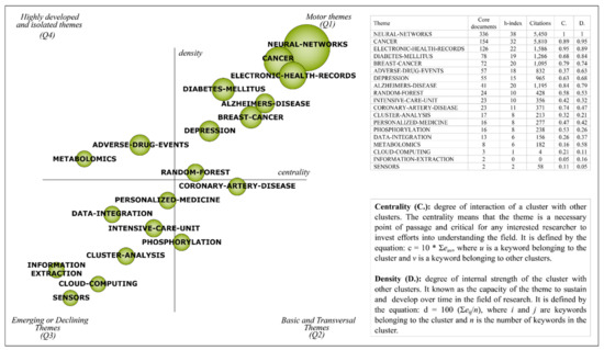 Figure 4 presents 19 clusters, 8 of which are categorized as motor themes (‘NEURAL-NETWORKS’, ‘CANCER’, ‘ELETRONIC-HEALTH-RECORDS’, ‘DIABETES-MELLITUS’, ‘ADVERSE-DRUG-EVENTS’, ‘BREAST-CANCER’, ‘DEPRESSION’ and ‘RANDOM-FOREST’), 2 as basic and transversal themes (‘CORONARY-ARTERY-DISEASE’ and ‘PHOSPHORYLATION’), 7 as emerging or declining themes (‘PERSONALIZED-MEDICINE’, ‘DATA-INTEGRATION’, ‘INTENSIVE-CARE-UNIT’, ‘CLUSTER-ANALYSIS’, ‘INFORMATION-EXTRACTION’, ‘CLOUD-COMPUTING’ and ‘SENSORS’), and 2 as highly developed and isolated themes (‘ALZHEIMERS-DISEASE’, and ‘METABOLOMICS’).