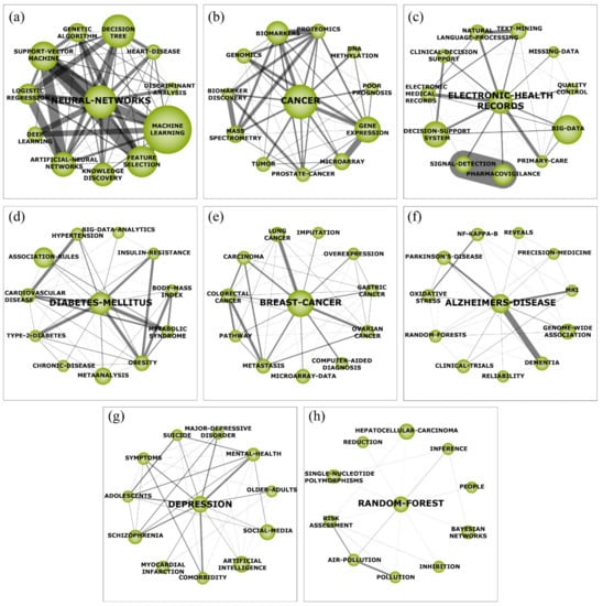 Thematic network structure of mining in healthcare (1995–July 2020). (a) The cluster ‘NEURAL-NETWORKS’. (b) The cluster ‘CANCER’. (c) The cluster ‘ELECTRONIC-HEALTH-RECORDS’. (d) The cluster ‘DIABETES-MELLITUS’. (e) The cluster ‘BREAST-CANCER’. (f) The cluster ‘ALZHEIMER’S DISEASE’. (g) The cluster ‘DEPRESSION’. (h) The cluster ‘RANDOM-FOREST’.