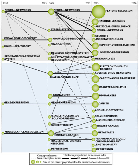 The cluster ‘KNOWLEDGE-DISCOVERY’ (Figure 6, 1995–2012), often known as a synonym for data mining, provides a broader view of the field differing in this way from the algorithm focused theme, that is data mining, where its appearance and, later in the third period, its fading could provide a first insight into the overall evolution of the data mining papers applied to healthcare. The occurrence of the cluster knowledge discovery in the first two periods could demonstrate the focus of the application of the data mining techniques in order to classify and predict conditions in the medical field. This gives rise to a competition with early machine learning techniques that could be potentially evidenced through the presence of the cluster ‘NEURAL-NETWORK’, which the data mining techniques could probably be benchmarked against. The introduction of the ‘FEATURE-SELECTION’, ‘ARTIFICIAL-INTELLIGENCE’, and ‘MACHINE-LEARNING’ clusters together with the fading of ‘KNOWLEDGE-DISCOVERY’ could imply the occurrence of a disruption of the field in the third sub-period that has led to a change in the perspective on the studies.