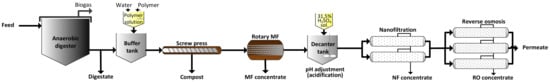 The synthesis of manure treatment processes implies a sequence of unit operations focusing on organic matter removal, nutrient recovery, solid separation, etc. As an example, Figure 1 shows the optimal solution proposed by Camilleri-Rumbau et al. [73] obtained by comparing different membrane technologies, physico-chemical operations and SLS techniques to recover nutrient-rich fractions from biogas digestate. The process was predicted to have a low energy consumption during solid-liquid separation and a low chemical consumption, thus proving the advantages of using membrane techniques to concentrate the nutrients present in digestate liquid fractions.