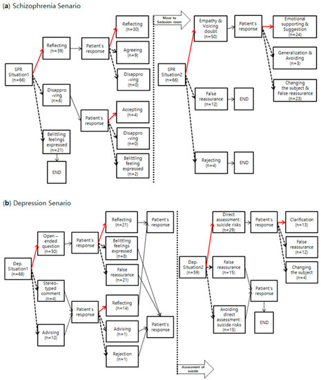 Red lines: the path for therapeutic communication skills; dotted lines: the path for non-therapeutic communication skills. n: number of students who chose the answer. (a) Schizophrenia scenario; (b) depression scenario.