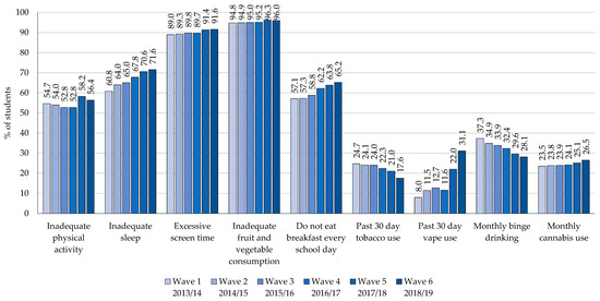 With respect to dietary behaviours, across waves >90% of students reported inadequate fruit and vegetable consumption according to the 2007–2019 Canada’s Food Guide recommendations with only slight changes from year-to-year. More than half of students reported not eating breakfast every school day, and this percentage increased between wave 1 and 6, particularly among female students.