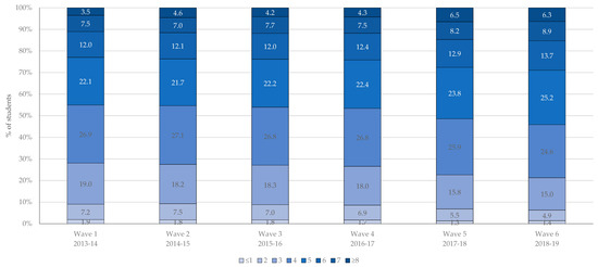 As shown in Table 2, students reported an average of 4.4 co-occurring health risk behaviours in wave 1; the mean increased to 4.8 co-occurring health risk behaviours by wave 6. Across waves, the mean number of co-occurring health risk behaviours increased among both male and female students. Students reported an average of 2 (out of a possible 3) co-occurring risk behaviours within the movement subcategory, 1.5 (out of a possible 2) co-occurring risk behaviours within the dietary subcategory, and 1 (out of a possible 4) co-occurring risk behaviours within the substance use subcategory. The mean number of co-occurring risk behaviours increased significantly among male and female students within the three subcategories of behaviours (movement, dietary, and substance use). As shown in Figure 2, less than 10% of students reported 2 or fewer co-occurring health risk behaviours and this percentage decreased between wave 1 and 6. In contrast, more than 10% of students reported 7 or more co-occurring health risk behaviours and this percentage increased between wave 1 and 6.