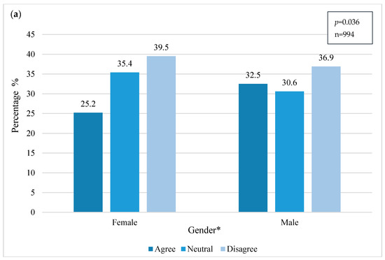 Although many respondents had heard about the issue, they were still critical and required more information to be available. The results are related with gender (chi2, p = 0.036), showing that men are less critical and often agree that the currently available information on this issue is adequate and sufficient. However, over 75% of women remained neutral (n = 198) or disagreed (n = 221) with this fact (Figure 5).