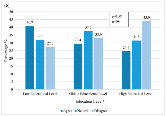 In Figure 5, educational level is significantly related with the opinion and criticism of the sample regarding the availability of relevant information (chi2, p < 0.001). The Kruskal–Wallis test also indicates significant differences between the education groups (H (2): 24.378, p < 0.001). The results show that those with a lower education level are less critical and generally more likely to accept what is offered (n = 61). Those who hold a master’s and PhD generally rather disagree that the information offered regarding the negative impacts of plastics on the human health is satisfactory. These findings are aligned with studies conducted in different regions (n = 248) [7,47].