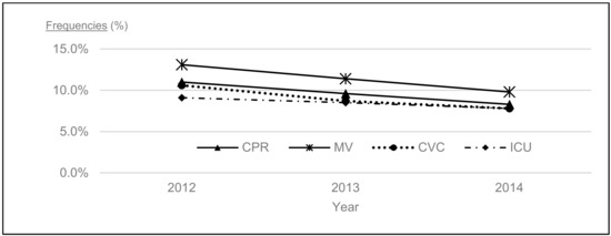 Annual trends in the administration of life-sustaining treatments and intensive care unit admissions in the last 7 days of life from 2012 to 2014. The vertical line represents the frequencies of administration of CPR, MV, CVC, and ICU admissions and the horizontal one year. Abbreviations: CPR: cardiopulmonary resuscitation, MV: mechanical ventilation, CVC: central venous catheter insertion, ICU: intensive care unit.