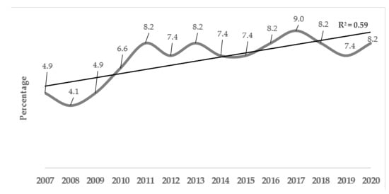 The 122 articles included in the synthesis were published in 49 indexed journals, primarily in English. They were predominantly publications in occupational therapy journals: Australian Occupational Therapy Journal n = 15 (12.3%); American Journal of Occupational Therapy n = 13 (10.7%) and the Scandinavian Journal of Occupational Therapy n = 10 (8.2%). The rest of the journals published less than ten articles that were relevant to the research questions between 2007 and 2020. As shown in Figure 2, the number of publications fluctuated, although a certain regularity was maintained, with an average of 8.3 annual publications. Furthermore, a gradual and stable increase in published studies was observed in the last ten years (Figure 2).