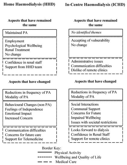 Twenty adults with ESRD (10 receiving HHD and 10 receiving ICHD) were enrolled in this study. Throughout the interviews in this study, it became clear that people expressed the impact of the COVID-19 restrictions through how aspects of their lives had changed or indeed remained similar to before the pandemic. Within this, the dimensions of PA, wellbeing and QoL, and medical care were discussed, and several key themes identified (Figure 1).