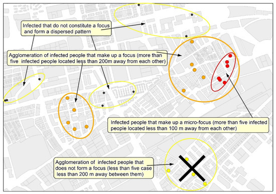 - The application of a cluster analysis with supervised criteria to the geolocated data of the infected people with the aim of generating groupings of at least five cases separated by less than 200 m in focuses, and 100 m in micro-focuses (see Figure 5). The Find Point Clusters tool from ArcGis Pro (ESRI) and the DBSCAN statistical method, which uses a certain distance to separate clusters, have been used.