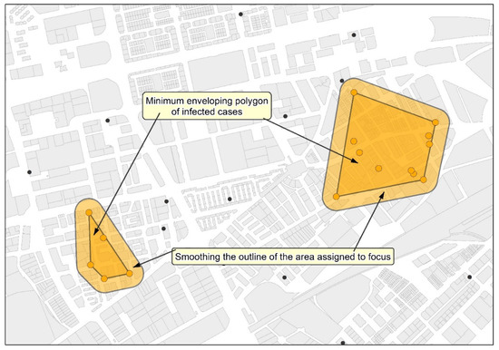 Figure 6. Assignment of the area corresponding to the different infected people (focus) groups and smoothing the limit of the focus.