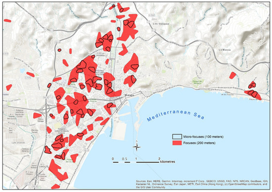 However, when analyzing the duration of the micro-focuses in two successive periods, it can be observed that this micro-unit is more ephemeral. From the eight micro-focuses detected in the first period, only three still remain during the second one (Figure 10). These results seem to indicate that the transmission does not always occur in the closest area of the neighborhood (closer than 100 m), but it rather expands to a buffer of 200 m, a zone that coincides with the daily walking average area proposed as the focus boundary.