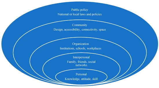 - McLeroy, K.R.; Bibeau, D.; Steckler, A.; Glanz, K. An Ecological Perspective on Health Promotion Programs. Health Educ. Q. 1988, 15, 351–377. [Google Scholar] [CrossRef]