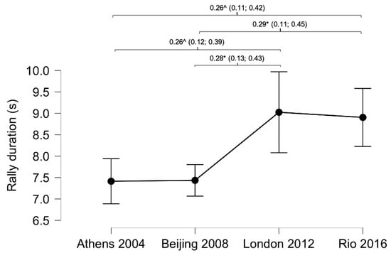 Differences in rally duration comparing Paralympic Games. Lines denote mean (95 CI). Effect sizes (±95% CI). * = p < 0.05; ^ = p < 0.01.