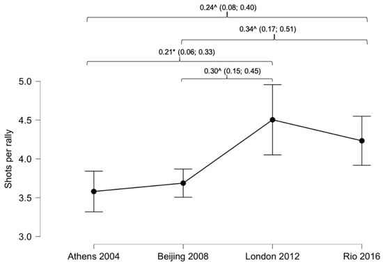 Differences in shots per rally comparing Paralympic Games. Lines denote mean (95 CI). Effect sizes (±95% CI). * = p < 0.05; ^ = p < 0.01.