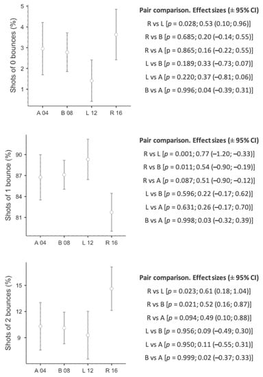 Differences comparing Paralympic Games in shots after zero, one or two bounces. Lines denote mean (95 CI). Pair Paralympic Games comparison (A 04: Athens 2004; B 08: Beijing 2008; L 12: London 2012; R 16: Rio 2016) on p value and effect sizes (±95% CI).