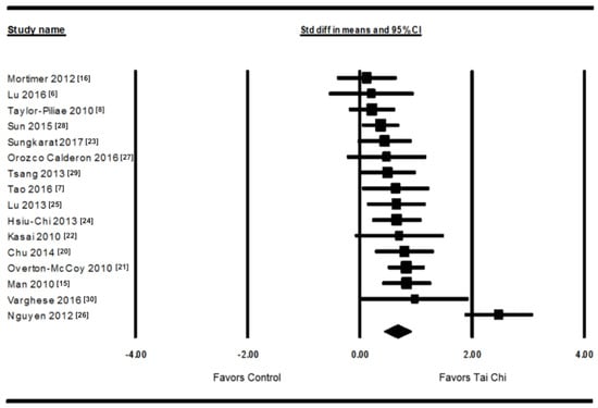 | Tai Chi practice duration for entire study (min) (16 studies) | −0.0000 min−1 | 0.6588 |