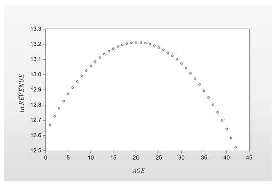 Equation (14) shows the growth rates of total revenue (REVENUES) corresponding to the years of establishment (AGE) of SMMCEs. It can be seen from Table 5, that the value is 0.00292 and significant. Although these coefficients are seemingly very small, Wooldridge [92] believes that they are significant because they allow us to calculate the partial effect and to observe the variation in the total revenue growth rate with the years of establishment of MCEs.