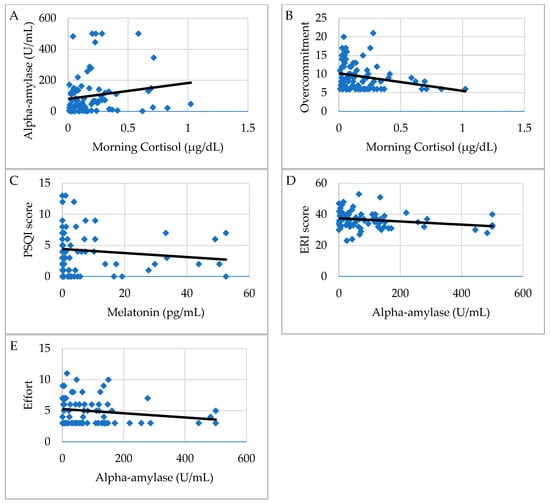 (A–E). Graphic representation of correlations between questionnaire scores and salivary biomarkers in dock workers. Figure shows the association of morning cortisol levels with α-amylase (A) and overcommitment scale of ERI (B), of salivary melatonin with Pittsburgh sleep quality index (PSQI) score (C), of α-amylase concentration with Effort reward imbalance (ERI) total score (D) and effort scale (E).