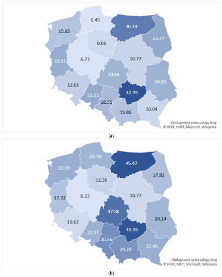 - Bieńkuńska, A.; Ciecieląg, P.; Haponiuk, M.; Nałęcz, S.; Sobestjański, K.; Wieczorkowski, R.; Jachowicz, I.; Kolasa, E.; Piasecki, T.; Szkopiecka, K.; et al. Regional Diversity of Quality of Life in 2015. 2017. Available online: https://stat.gov.pl/obszary-tematyczne/warunki-zycia/dochody-wydatki-i-warunki-zycia-ludnosci/terytorialne-zroznicowanie-jakosci-zycia-w-polsce-w-2015-r-,25,1.html (accessed on 3 March 2021).