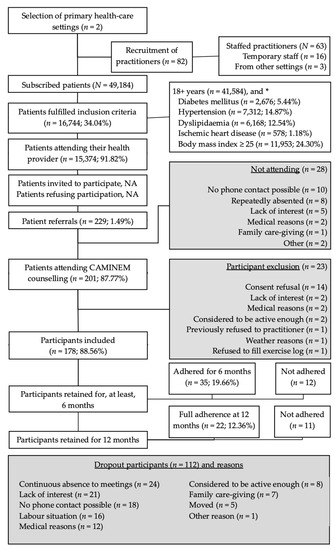 Flowchart of the participants included in the CAMINEM intervention. * Patients may have more than one condition. The CAMINEM Programme addressed patients from two primary health-care settings in socially disadvantaged neighbourhoods. All practitioners (physicians and community nurses) were invited to participate. Patients to be included had to be visited by their practitioner during a regular visit, accepted their oral invitation, being referred to the exercise physiologist and finally sign the informed consent. Retention refers to not drop out while adherence shows fulfillment of the exercise prescription.