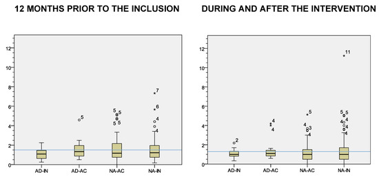 Health-care provider visits per month by intervention groups. Note. Blue lines = mean. AD-IN = adhered and previously inactive, AD-AC = adhered and previously active, NA-AC = non adhered and previously active, NA-IN = non adhered and previously inactive * stands for “Outliers”.