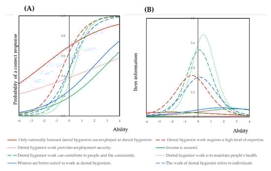Item response and item information curves of the eight items contributing to the job satisfaction of dental hygienists. (A) Item response curve. (B) Item information curve.
