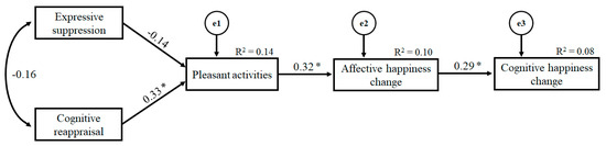 The results of the path analysis revealed an optimal fit of the proposed model (χ2(5) = 4.92, p = 0.42; CFI = 1.00; RMSEA < 0.001). Figure 1 shows the model with the standardized path coefficients and proportion of explained variance. According to these results, cognitive reappraisal was significantly associated with engagement in pleasant activities during the COVID-19 lockdown period. In turn, these pleasant activities were related to more positive affective happiness during the COVID-19 lockdown (in comparison with pre-pandemic levels), which was related to higher levels of cognitive happiness. The emotion regulation strategy of expressive suppression was not significantly related to engagement in pleasant activities; however, the resulting model after removing the path between expressive suppression and pleasant activities from the original model showed slightly worse fit indices (χ2(3) = 4.84, p = 0.18; CFI = 0.93; RMSEA = 0.08), although differences between models were not significant (χ2 diff = 1.87, df diff = 1, p > 0.05).