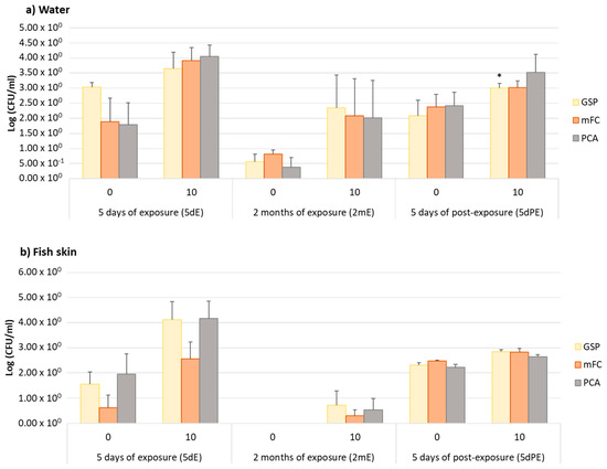 Total counts (Log (CFU/mL)) of antibiotic-resistant bacteria from nonexposed (0 µg/L) and oxytetracycline (OTC)-exposed (10 µg/L) samples at each sampling time (5 days of exposure: 5 dE; 2 months of exposure: 2 mE and 5 days of postexposure: 5 dPE). Counts were determined in selective media (Glutamate Starch Phenol Red Agar (GSP), Membrane Fecal Coliform agar (mFC) and Plate Count Agar (PCA)) supplemented with tetracycline (TET) at 16 µg/mL. Asterisks (*) represent statistically significant differences (p ≤ 0.05) towards the respective control (nonexposed water and fish skin).
