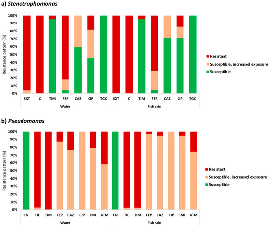 Antibiotic resistance profiles of the selected isolates are represented in Figure 2. Stenotrophomonas isolates were resistant to chloramphenicol (100% in water and fish skin) and trimethoprim/sulfamethoxazole (water: 95% and fish skin: 100%) followed by cefepime (water: 82% and fish skin: 71%). All Stenotrophomonas isolates were revealed to be sensitive to tigecycline. Regarding Pseudomonas, isolates were resistant to ticarcillin/clavulanic acid (water: 100% and fish skin: 97%) and ticarcillin (97% in water and fish skin). All Pseudomonas isolates were shown to be sensitive to gentamicin and displayed a reduced susceptibility to ciprofloxacin. These results suggest that the resistance profiles differ according to the origin (water or fish skin). In fact, bacterial communities of both matrices are influenced by distinct factors. For instance, fish mucus is a complex fluid containing several proteases, lectins and antimicrobial peptides, which acts a barrier against pathogens and harbors a highly specific bacterial community [46,47,48]. Indeed, a previous work reported multidrug resistance among bacteria from freshwater fish mucus [49].
