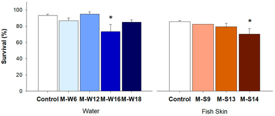 Survival percentage (%) of zebrafish embryos exposed to multidrug-resistant bacteria isolated from water and zebrafish skin. Strains were obtained from samples exposed to 10 µg/mL of OTC, after a 5-day postexposure period (5 dPE) period. Asterisks (*) represent statistically significant differences (p ≤ 0.05) towards the control.
