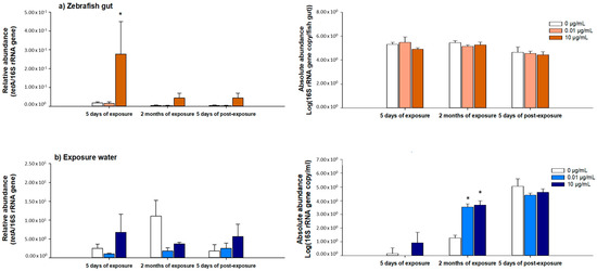 Relative abundance of tet(A) and absolute abundance of 16S rRNA gene (Log gene copy number/mL or fish gut), determined by qPCR in (a) zebrafish gut and (b) water exposed to OTC (0, 0.01 and 10 µg/mL) at three sampling times (5 days of exposure: 5 dE; 2 months of exposure: 2 mE; and 5 days postexposure: 5dPE). Asterisks (*) represent statistically significant differences (p ≤ 0.05) towards the respective control (0 µg/mL).