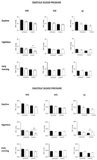 Compared with the untrained status, early morning SBP was unchanged in all groups. The 24-h and nighttime diastolic BP decreased only in the HIIE group (p = 0.04 and p = 0.0001 between groups, respectively) (Figure 2 and Figure 4).