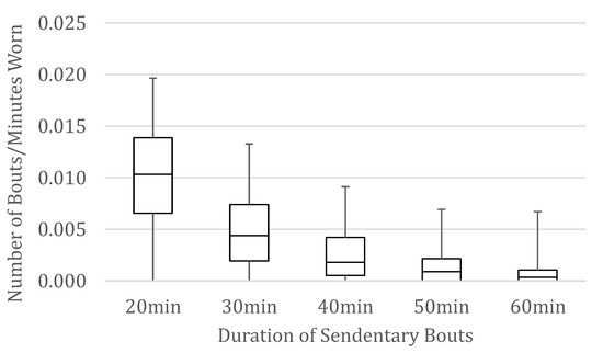 Box and whisker plots of the number of bouts of uninterrupted sitting 20–60 min per minute that the device was worn.
