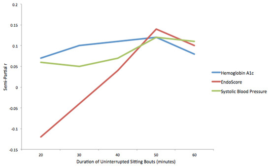 The results of regression models using the standardized number of uninterrupted sitting bouts of various durations to predict hemoglobin A1c, EndoScore and systolic blood pressure are presented in Table 2 and Figure 2. The frequency of uninterrupted sitting bouts was not related to hemoglobin A1c, EndoScore, or systolic blood pressure at any bout duration. As the duration of uninterrupted sitting bouts increased from 20 min to 50 min, the effect size, indicated by the semi-partial correlation coefficient, demonstrated a pattern of increasing strength for both hemoglobin A1c (0.07–0.12) and systolic blood pressure (0.06–0.12). A post hoc power analysis was conducted using G*Power 3.1.9.4 [46]. With statistical power set at 0.80 and alpha set at 0.05, a sample size of 540 participants would be needed to detect a semi-partial correlation of 0.12.