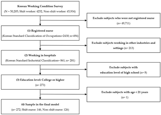 This study was a secondary analysis of the Fifth Korean Working Conditions Survey (KWCS) [29], and an institutional review board determined the study to be exempt (No. 1041078-202006-HRSB-147-01). The Fifth KWCS used a cross-sectional design and collected data between 11 July and 17 November 2017 in 17 cities and provinces nationwide [30]. The survey first extracted stratified districts and then extracted households, using probability proportional to size systematic sampling. Professional investigators visited the selected households and interviewed one individual worker each, aged over 15. The eligible individuals were workers (either employees or self-employed) who worked at least one hour for pay and profit during the last week at the time of the interview. Retired and unemployed individuals, housewives, and students were excluded. The participants were informed of the voluntary nature of the participation and confidentiality of their responses. The total number of households for interviews was 130,645, and the total number of survey respondents was 50,205. Households were replaced if the investigators could not interview eligible individuals after visiting four times. Households were excluded for (1) refusal: 28,262 cases, (2) non-contact: 8808 cases, (3) inability to interview (e.g., drinking, speech impairment): 2194 cases, (4) ineligible: 15,032 cases, (5) unknown eligibility: 23,007 cases, and (6) unknown residence: 3137 cases. The survey response, cooperation, and refusal rates were 44.9%, 64.0%, and 25.3%, respectively. In this secondary analysis, the inclusion criteria were (1) being a registered nurse and (2) working in hospitals (Figure 1). Respondents who reported their educational level as high school were excluded because all registered nurses in South Korea must have an associate degree or higher. Finally, 272 nurses were included.
