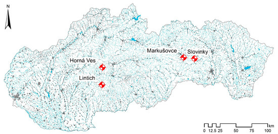 Location of sampling areas in the map of Slovakia: Slovinky (SLS-slag, SLD-dam), Markušovce (MAS-sludge, MAD-dam), Lintich (LIS-sludge, LID-dam), Horná Ves (HVS-sludge, HVD-dam).