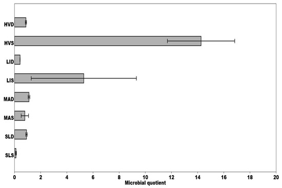 The microbial quotient (qMic) often refers to the microbial activity and its potential to mineralize organic matter in the soil. The lower values of this quotient are usually associated with reduced availability of organic material for the microorganisms. The microbial quotient was highest at the HVS and LIS sites, respectively and, conversely, lowest in the case of SLS, SLD, HVD (Figure 4). Moreover, we found a positive correlation between qMic values on one hand and cadmium, or lead concentrations on the other (r = 0.86, p < 0.05) (Figure 3). The significantly higher qMic values were detected in the HVS sample.