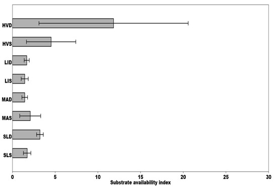 The SAI (substrate availability index) ratio of potential to basal respiration decreases as microbial activity increases, suggesting the amount of readily available organic substances in the substrate. Determined SAI values were low in all the sediments except HVD (Figure 6), which indicates the ability of microorganisms to utilize the readily available organic substances provided by the substrate. Together with the microbial quotient (qMic) values mentioned above, these findings are entirely unexpected. The values of three microbial indicators (SAI, qCO2, qMic) were balanced on all monitored areas, except the HVD, where several times higher substrate availability index values were detected (Figure 6). In this pond’s sludge (HVS), we found significantly higher values of the microbial quotient and low metabolic quotient values (Figure 4 and Figure 5).