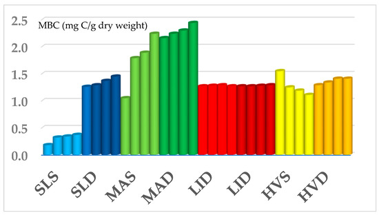 Evolution of microbial biomass carbon (MBC) values (mg C/g) during four sampling seasons on each monitored locality–every color represents a sample: SLS (light blue), SLD (dark blue), MAS (light green), MAD (dark green), LIS (light red), LID (dark red), HVS (yellow), HVD (orange); the average values are shown in the figure for every season, the standard deviation of the means of seasons I–IV were as follows: SLS ± 0.07; 0.08; 0.06; 0.03, SLD ± 0.08; 0.04; 0.13; 0.14, MAS ± 0.04; 0.85; 0.14; 0.07, MAD ± 0.14; 0.13; 0.22; 0.08; LIS ± 0.11; 0.17; 0.11; 0.18, LID ± 0.16; 0.22; 0.12; 0.11, HVS ± 0.33; 0.19; 0.28; 0.18, HVD < 0.01; ±0.04; 0.06; 0.07.