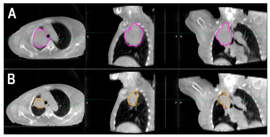 Example of gross tumor volume (GTV) contouring to determine tumor regression during chemoradiation (left to right: axial, sagittal, and coronal views). (A) Cone-beam computed tomography (CBCT) of a patient in week 1 of treatment, with GTV contoured in magenta. (B) CBCT of the patient in week 6 of treatment, with GTV contoured in gold.
