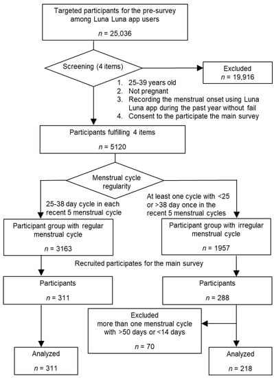 A flowchart of the study design is shown in Figure 1. We published a notice of the research goals regarding “menstrual cycle and chronotype” on the Luna Luna app and asked participants to answer a screening survey. This survey comprised four items requesting the following information: (1) age, (2) the frequency with which they recorded their menstrual cycle onset on the Luna Luna app during the past year, (3) whether they were pregnant or not, and (4) whether they would consent to participating in the main survey requiring approximately 20 min. There were 5120 women fulfilling the following criteria: (1) 25–39 years old, (2) not pregnant, (3) menstrual cycle onset was recorded on the Luna Luna app during the past year without fail, and (4) consented to participate in the main survey. We analyzed the five most recent menstrual cycles of these participants and classified them into two groups: regular menstrual cycle, with each cycle lasting 25–38 days (n = 3163); and irregular menstrual cycle, with at least one cycle of <25 or >38 days (n = 1957). We recruited participants for the main survey via the Luna Luna app, with the intention of enrolling 300 participants in each group. A $5 gift card was offered to the participants of the main survey. We were able to enroll 311 and 288 participants in the regular and irregular menstrual cycle groups, respectively. Of these participants, 70 women recorded more than one cycle with >50 days or <14 days and these data were excluded from our analysis to eliminate the possibility of participant input error (Figure 1).