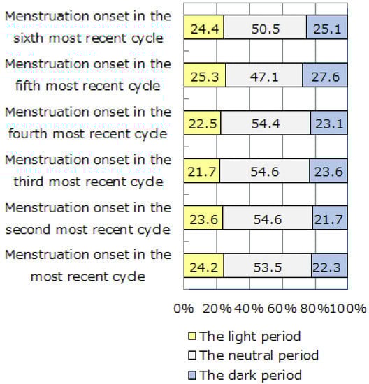 The proportions of participants with menstruation onset in the light, dark, and neutral periods in their six most recent menstrual cycles (n = 529). There was no significant difference in the proportions of participants with menstrual cycle onset in the light and dark periods during each of the six menstrual cycles.