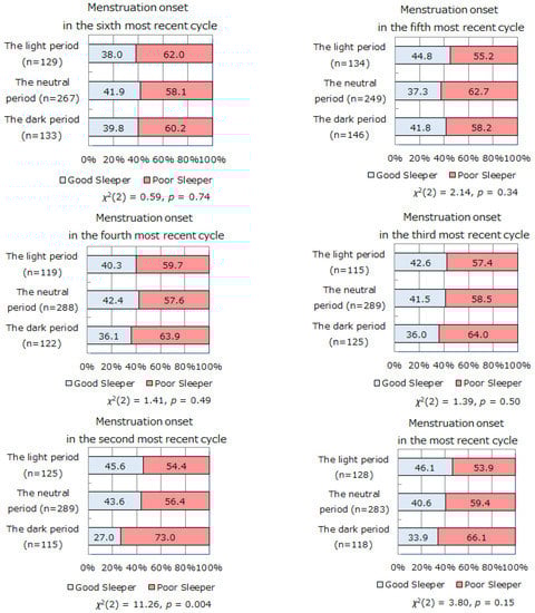 The proportions of good sleepers and poor sleepers with menstruation onset in the light/dark/neutral periods during their six most recent menstrual cycles. The proportion of subjective poor sleepers was significantly higher in participants with menstrual cycle onset in the dark period than in those with onset in the light period, in the second most recent menstrual cycle. The same tendency was observed in the most recent menstrual cycle.