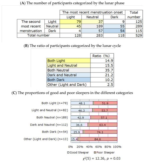 The relationship between subjective sleep quality and the combination of lunar phase (light, dark, neutral periods) in the two most recent menstruation onsets. Participants were categorized by the combination of lunar phases at the most recent and the second most recent onset of menstrual cycle (A,B), and the proportions of good and poor sleepers were calculated (C). The proportion of good sleepers was highest in the “both light period” group, followed by the “light and neutral period” group and the “both neutral period” group. The “both dark period” group and the “other (light and dark period)” group showed the lowest proportions of good sleepers.