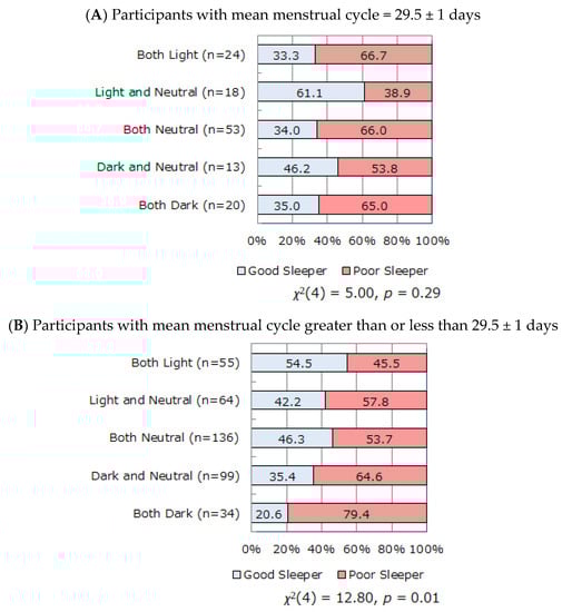 The numbers of menstrual cycle onsets during the light and dark periods were compared between good sleepers and poor sleepers, as categorized by the Pittsburgh Sleep Quality Index (PSQI) [,]. The numbers of menstrual cycle onsets during the light and dark periods were respectively 345 (55%) and 287 (45%) among good sleepers, and 423 (46%) and 504 (54%) among poor sleepers. The binominal test revealed that the proportion of good sleepers with menstrual cycle onset during the light period was significantly higher than that during the dark period (z = 2.31, p = 0.02), while the proportion of poor sleepers with menstrual cycle onset during the dark period was significantly higher than that during the light period (z = −2.66, p = 0.01).