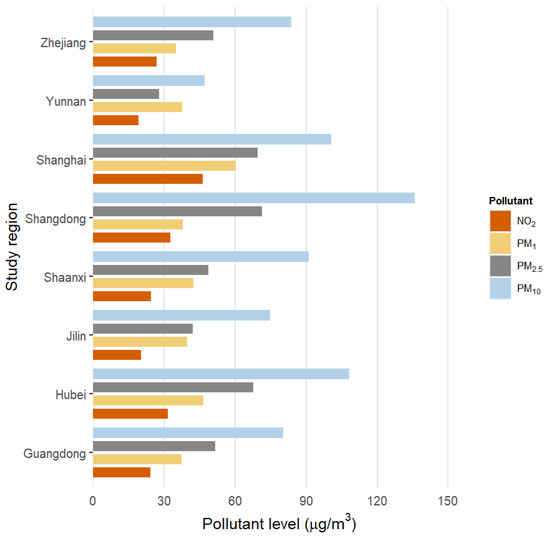 Several previous studies studied the association between particulate matter air pollution and CRP; however, significant questions remain [18,19,20]. For example, in a recent meta-analysis of 40 observational studies, including a total of 244,681 participants, investigators found that, while long-term exposure to ambient air pollution was more strongly associated with CRP levels than short-term exposure, the majority of prior literature focused on short-term exposure windows [21]. Additionally, while the burden of air pollution exposure is known to be significantly greater in developing nations, the studies linking PM to CRP so far have been disproportionally performed in populations from economically developed regions [22], such as Europe and the United States (US) [21]. To date, there have been no studies evaluating the long-term relationship between ambient air pollution and levels of CRP in the Chinese population, which is still, despite substantial progress, exposed to high levels of outdoor pollution [23]. The results of studies assessing associations between NO2 exposure and CRP levels were inconclusive [24,25,26,27], and no data have been published regarding PM1, which is believed to be even more toxic than other pollutants [28]. Lastly, most prior studies were conducted on young populations, which may be at lower risk for the detrimental cardiovascular consequences of air pollution-induced chronic inflammation [21].