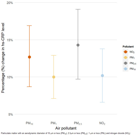 These associations, however, have been less consistent in the case of nitrogen dioxide. Multiple studies from European countries, as well as one study from the US and another one from Taiwan, failed to demonstrate any substantial links between levels of ambient NO2 and serum CRP levels [24,26,27,40,47,48,49,50,51,52]. On the contrary, an analysis of two large European cohorts involving 51,459 participants found a 1.9% increase in hs-CRP in association with a 7.4 μg/m3 increment in NO2 exposure [53]. Our study revealed stronger associations (11.8% per 10 μg/m3 increase in 3 year moving averages of outdoor NO2), which can be possibly explained by the older mean age of participants (63.2 vs. 47.6 years), as well as greater co-exposure of other pollutants.