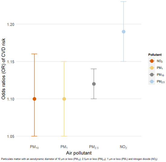 Figure 3 presents the results of the logistic regression models. We observed higher odds ratios (ORs) of CVD risk (defined as hs-CRP > 3 mg/L) for 10 μg/m3 increments of PM10 (OR: 1.12 (95% CI: 1.10, 1.14)), PM2.5 (1.19 (95% CI: 1.15, 1.23)), PM1 (1.10 (95% CI: 1.05, 1.15)), and NO2 (1.10 (95% CI: 1.05, 1.16)).