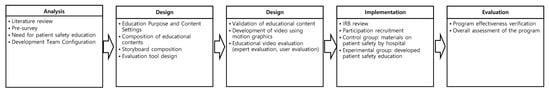 In this study, an instructional systems design was employed based on the analysis–design–development–implementation–evaluation (ADDIE) model [33] to develop a patient safety education program (Figure 1). According to the procedure of the ADDIE teaching–learning model, the literature on patient safety education related to learning was reviewed and the needs of the subjects were researched and analyzed. After the educational contents were designed, based on the analysis outcomes, and the teaching strategy was established, audiovisual learning materials using motion graphics were developed. After implementing the education program developed for inpatients, its effects on the knowledge, awareness, and willingness to participate in patient safety were measured.
